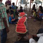 Bij het JET huis is een eigen tuin waar de kinderen zelf helpen bij het verbouwen van de groente. Hier maken de meisjes de net geoogste boontjes schoon voor de lunch, die bestaat uit rijst, groenten en een saus.